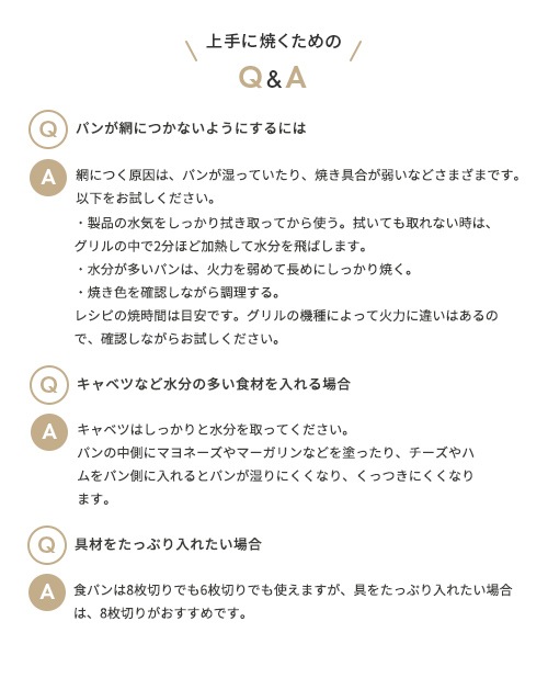 | 【使用前にご確認ください】 | ・ご使用いただける調理器はガスコンログリル、調理器のグリル、オーブントースターです。 ・調理器の庫内サイズは幅 17cm、奥行25.5cm、高さ4.5cm以上必要です。 ・本レシピ掲載の調理時間はガスコンログリルの片面焼きタイプの場合です。ガスの両面焼きをご使用の際は、下にアルミホイルや金属製のプレートを敷き、片面焼きの状態にしてご使用ください。下水が近いためパンが焦げやすくなります。 ・魚焼きグリルは熱源や庫内の広さによって焼き時間が異なります。はじめは短い時間から様子を見ながら火カや焼き時間を調整してください。IH調理器のグリルの場合、ガスに比べて時間がかかることがあります。 ・オーブントースターでご使用の際はお使いの機種の取扱説明書をご確認の上、加熱時間を調軽してください。 ・チーズを入れた時など、加熱時間を長くしたい場合は、火力を弱めて調理してください。 |