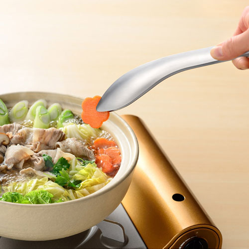 軽くにぎってしっかりつかめる盛りつけトングです。