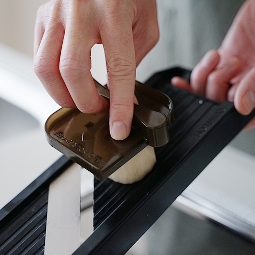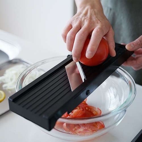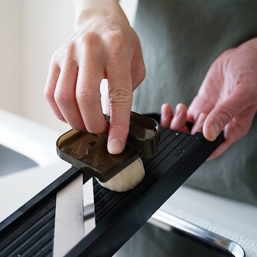 ハンドルを手で握り、もう片方の手で食材を持ちスライスします