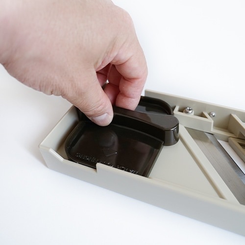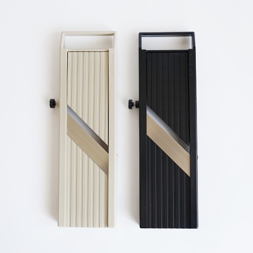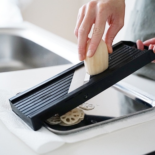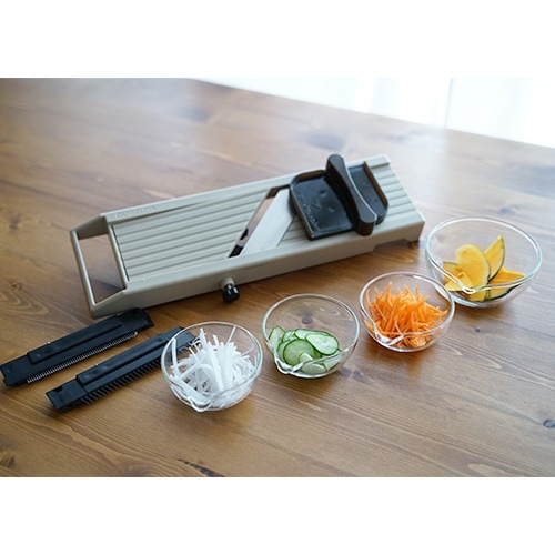 | 注意事項 | ・野菜・果物用のスライサーです。 ・食器洗浄乾燥機での洗浄は変形につながる恐れがありますので中性洗剤を使用して手洗いしてください。クシ刃の掃除には歯ブラシが適しています。 ・使用中に破損・変形・ガタつきが生じた場合は使用を中止してください。 ・小さな野菜を切る時は必ず保護ホルダーをご使用ください。 切り終わりまで素手で使用すると重大な怪我につながります。 ・ 刃物は良く切れますので、刃物の着脱や厚み調整の際などは十分注意してください。 ・平刃交換の際は先にクシ刃を取り外してください。平刃がクシ刃に接触して破損する場合があります。 ・取扱中に指を刃物にひっかけてケガをする危険があります。 特に無理な力をかけての作業は極めて危険です。 ・急いでの作業は危険です。刃物に細心の注意を払って作業してください。 ・ガスコンロや高温になる場所などの近くへは置かないでください。 変形・破損・火災の原因となります。 ・使用状況により刃物が欠ける可能性があります。使用中は常に注意し、 欠けや割れを発見した場合は切った食材を全て処分してください。 特にクシ刃は横方向からの強い力に弱いです。 ・クシ刃を洗った後は軽く振って水気を飛ばし風通しの良い場所で乾かしてください(濡れたまま密封した容器などにしまわない)。錆びて刃の強度が落ちる可能性があります。 ・潤滑目的で油をささないでください。樹脂が劣化します。 ・保管の際は厚み調整ネジを時計回りに回して、刃先よりも厚み調整板が上になるようにしてください。 ・お子様の手の届かないところに保管してください。 |