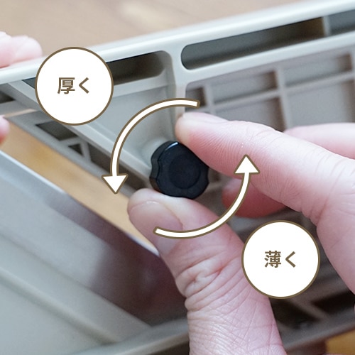 左に回すと厚くなり、右に回すと薄くなります。